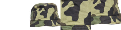 Camo bucket hat. Green camouflage pattern. Circumferential brim. Decorative stitching.