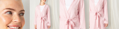 65% polyester/35% cotton waffle weave. Lightweight fabric. Kimono style robe. Two patch pockets. Tie front. Hanging loop.