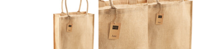 Laminated jute. Cotton carry/shoulder handles (65cm long). Capacity 19 litres.