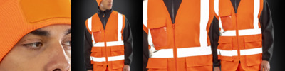 80% polyester/20% cotton. Orange and yellow conform to EN ISO 20471: 2013 + A1: 2016 class 2. RIS-3279-TOM (orange only). Black and navy conform to EN17353: 2020 type B3 (enhanced visibility only). Front zip closure. Right chest tear release pocket with ID pocket. Two reflective bands around the body and one over each shoulder. Two front tear release pockets, left pocket with extra length. D-ring. Self colour bound edges. Tag free.
