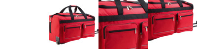 600D polyester. Carry handles with pad. Detachable adjustable shoulder strap. Large main compartment. End zip pockets. Front zip pocket. Baseboard. Studded base. Capacity 48 litres.