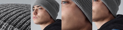 95.5% acrylic/4% polyester/0.5% elastane. Ribbed knit. Retro styling. Shallow crown. Cuffed design.