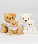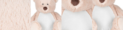 100% polyester. Soft plush mid brown bear. Sewn eyes. Contrast brown nose. White coloured panel on tummy and feet. Removable inner pad. Zip access for decoration onto front panel. Suitable for embroidery, print and sublimation.