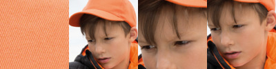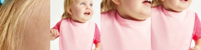 100% organic ringspun cotton.* Organic or in-conversion to organic cotton. One side with contrast bound edges. One side solid colour. Two position popper closure on back neck. Tear out label.