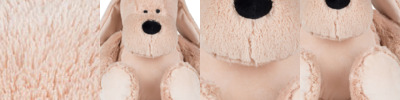 100% polyester. Soft plush mid brown dog. Floppy ears. Sewn eyes. Contrast brown nose. White coloured panel on tummy and feet. Removable inner pad. Zip access for decoration onto front panel. Suitable for embroidery, print and sublimation.