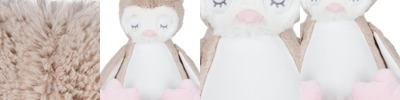 100% polyester. Soft plush light brown owl. Contrast nose and feet. White coloured panel on tummy and under wings. Removable inner pad. Zip access for decoration onto front panel. Suitable for embroidery, print and sublimation.